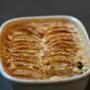 - Die Zutaten für den Guss in einer Schüssel gut vermischen und über das Gratin geben.