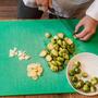 - Rapsöl in der Bratpfanne erhitzen, Rosenkohl, Knoblauch und Ingwer dazugeben und etwa 3 Minuten goldbraun anbraten.