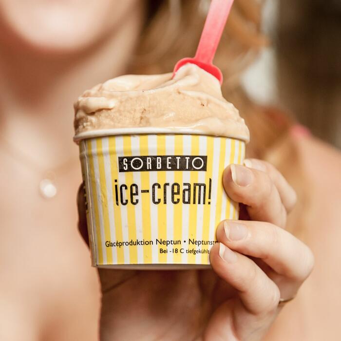 Ein "Chübeli" Glacé schmeckt auch tiptop mit einem Dessert vom Buffet oder einer Patisserie von der Theke kombiniert.