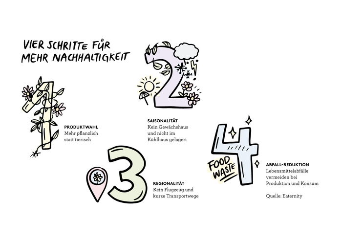 Bis 2050 verdoppelt sich unter anderem durch Populationswachstum und den vermehrten Fleischkonsum der weltweite Emissionsausstoss durch unsere Nahrungsmittel. Und dieser ist beachtlich: Mehr als ein Drittel der Treibhausgase entstehen durch unsere Ernährung; das ist mehr als durch Mobilität und Wohnen entsteht. Damit wir das weltweite 2-Grad-Klimaziel aller Nationen erreichen können, müssen wir unsere Ernährungsweise also dringend anpassen. «Mit einer cleveren Selektion von pflanzlichen, saisonalen und regionalen Lebensmitteln lassen sich über 50 % der Emissionen einsparen», erklärt Manuel Klarmann von Eaternity. Die Organisation hilft Restaurants dabei, ihr Angebot klimafreundlicher zu gestalten, und ist überzeugt, dass wir klimaschädigende Treibhausgase durch eine Umstellung unserer Ernährung bis um die Hälfte reduzieren können. Dass wir weniger Fleisch und tierische Produkte essen, ist dabei bereitsein wichtiger Schritt, weiss Klarmann: «Die meisten Emissionen entstehen durch die Futtermittelproduktion und die Methangase der Wiederkäuer wie Kühe, Schafe und Ziegen.»