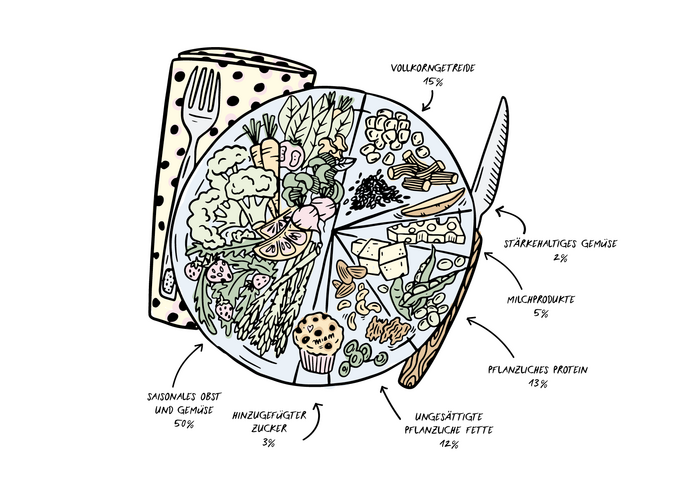 Mit der Frage, wie eine klimafreundliche Ernährung aussehen könnte, hat sich auch das Forscherteam der EAT-Lancet-Kommission auseinandergesetzt. Die Wissenschaftler zeigen in einem Bericht, der Anfang dieses Jahres erschienen ist, auf, wie eine gesunde und zugleich ökologisch nachhaltige Ernährung aussehen würde. Der Teller sollte zur Hälfte aus Gemüse und Obst bestehen, die andere Hälfte aus Vollkorngetreide, pflanzlichen Proteinquellen und ungesättigten pflanzlichen Ölen. Tierische Proteinquellen sind optional und nur in sehr kleinen Mengen vertreten (siehe Abbildung). Davon ist unsere Ernährung leider noch weit entfernt. Der durchschnittliche Konsum von gesunden Lebensmitteln wie Obst, Gemüse, Hülsenfrüchten müsste mehr als verdoppelt werden, während der globale Konsum von hinzugefügtem Zucker und rotem Fleisch um die Hälfte reduziert werden müsste.