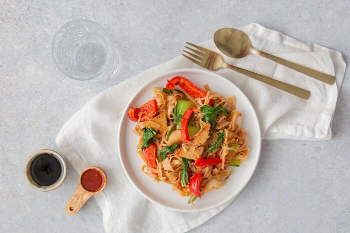 In unserem Indonesischen Stir-Fry mit Reisnudeln versorgen euch Vollkorn-Reisnudeln mit gesunden Kohlenhydraten während Tempeh reichlich pflanzliche Proteine liefert. Verschiedenes Gemüse wie Frühlingszwiebeln, Pak Choi und Peperoni sorgen für die Extraportion Vitamine.