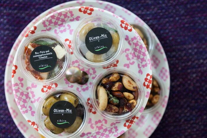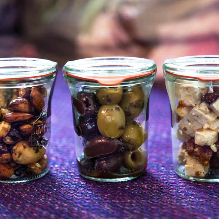 - Drei Knabbermixe: Gröstete Nussmischung mit Cranberries / gemischte Oliven / Feta und sonnengetrocknete Tomaten