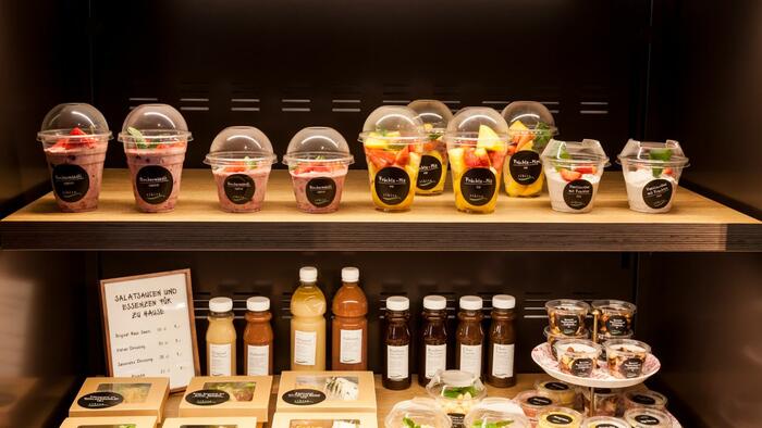 Anstatt beim Buffet Zeit zu verlieren, schnappt ihr euch an der Take Away Vitrine einfach einen Salat, ein Birchermüesli, frische Früchte oder ein Nussknabbermix nach Wahl, macht einen kurzen Abstecher an die Kasse und weiter geht's.