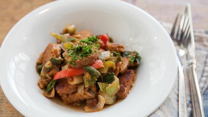 Wir richten unser "Indonesisches Tempeh" mit Pak Choi, Sojasprossen, Peperoni, Zitronengras, Ingwer, Teriyaki Sauce und Erdnusscreme an [Update: Unsere neue Teriyaki Sauce ist neu vegan und das Gericht somit auch!].