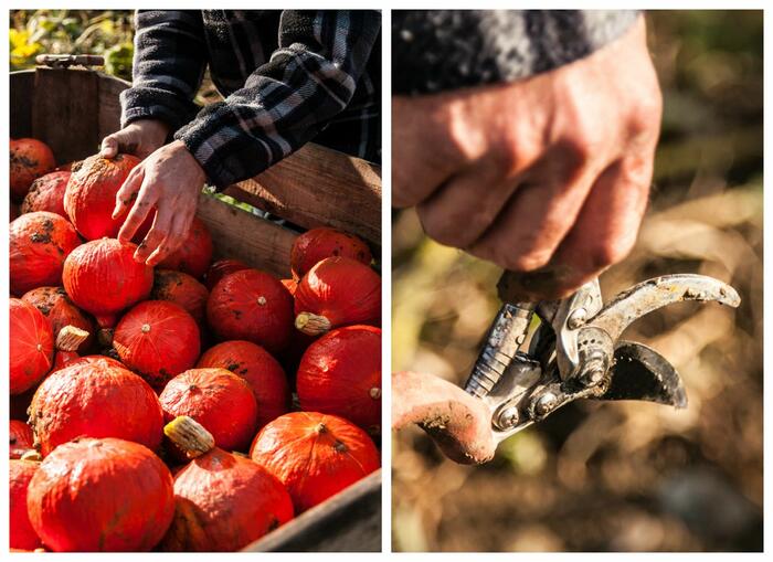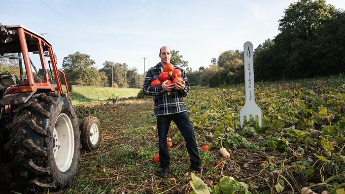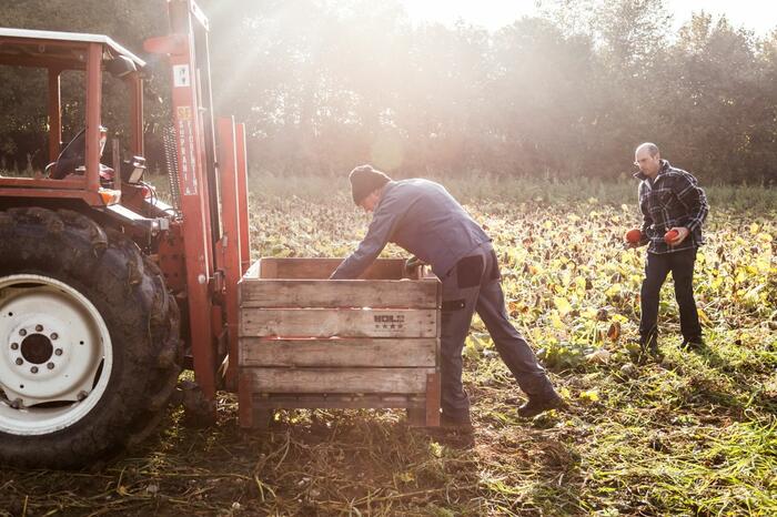Ohne Eile, aber in einem zügigen Tempo schneiden Klaus Böhler und sein Vater an diesem schönen Herbstmorgen die Kürbisse, tragen sie zum Traktor zurück und legen sie Stück für Stück in die Transportbox. Das ist pure Handarbeit - mit Liebe zum Detail, damit kein Kürbis anschlägt und kaputt geht.