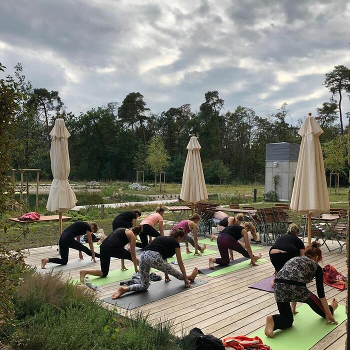 Bei schönem Wetter findet die Yoga-Lektion draußen unter freiem Himmel statt.