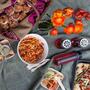 - Die Tomaten mit dem Olivenöl und den Gewürzen in eine Schüssel gut vermischen, auf einem Backblech geben und im auf 180 Grad vorgeheizten Ofen (Umluft) 10 Minuten backen.