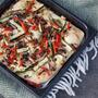 - Zucchetti und Peperoni in 1cm breite Streifen schneiden. Die Champignons und und die Frühlingszwiebel in 1/2 cm Scheiben schneiden.