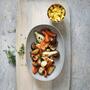 - Salz, Olivenöl und Balsamicoessig dazugeben, alles gut vermischen und auf einem mit Backpapier belegten Blech auslegen. Im vorgeheizten Ofen 15-20 Minuten backen.