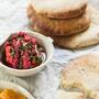 - Die Naanfladen 10 Minuten ruhen lassen. Die heissen Backbleche aus dem Ofen nehmen und die Naanbrotfladen auf dem Backpapier vorsichtig auf die Bleche ziehen. 3 - 5 Minuten im Ofen backen bis sie goldbraune Stellen entwickeln. Die Fladen auf einem Gitter etwas auskühlen lassen. Warm mit dem Randenhummus servieren und geniessen.