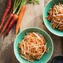 - Die Karotten und den Sellerie schälen und mit einem scharfen Messer oder einem Spiralschneider in dünne Streifen schneiden. Das geschnittene Gemüse in eine grosse Schüssel geben.