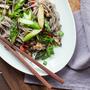 Die Sobanudeln nach Packungsanleitung kochen, kalt abspülen und in einer Schüssel mit kaltem Wasser beiseite stellen.