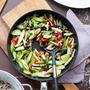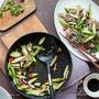 Sesamöl in einer Bratpfanne erhitzen und die Chilischoten und Shiitakepilze bei mittlerer Hitze kurz anbraten, zurück in die Schale geben. Spargeln in die Bratpfanne geben und bei mittlerer bis hoher Hitze anbraten, eventuell noch etwas Sesamöl hinzufügen.