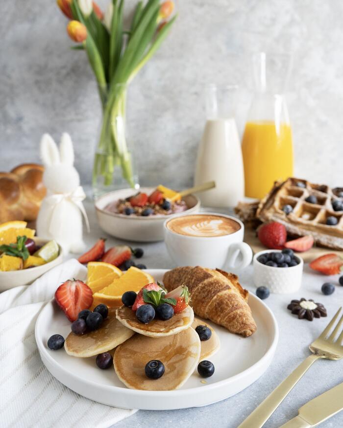 Let's brunch ! Croissants croustillants, jus d'orange fraîchement pressé, œufs brouillés version végétalienne et pancakes - à Pâques, retrouvez tous les classiques du petit-déjeuner et bien plus encore !