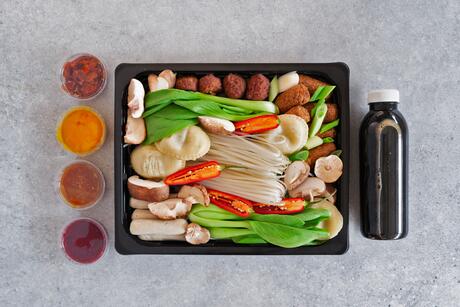Nous avons entendu vos souhaits et amélioré le contenu et la taille de notre fondue chinoise. Vous trouverez désormais une sélection exquise d’alternatives à la viande telles que les cevapcici, chipolatas et boulettes végétaliennes avec des dumplings farcis aux légumes, des vermicelles de riz ainsi que divers légumes frais et croquants. Faite maison avec beaucoup d'amour par l’équipe tibits, notre fondue chinoise est accompagnée de notre bouillon épicé et de quatre sauces tibits : sauce cocktail, sauce satay, sauce sweet chili et chutney courge-yuzu.