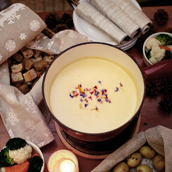 La fondue végane de New Roots est de retour! À partir du 24 octobre, vous pourrez à nouveau déguster la fondue à base de noix de cajou chez nous, au tibits. Elle est accompagnée de bon pain, de légumes et de poires.