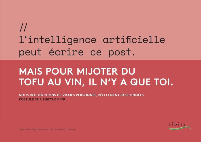 Avec cette campagne, nous souhaitons soutenir l'ensemble de l'industrie de la restauration. Après les périodes difficiles liées à la pandémie, nous voulons rappeler de manière positive les valeurs que nous, ainsi que toute la branche incarnons. Que serait la gastronomie sans de vraies personnes, réellement passionnées ? Notre nouvelle campagne de marque employeur illustre de manière ludique les limites de l'intelligence artificielle. En effet, à la différence de tibits, l'intelligence artificielle ne se soucie guère des êtres vivants.