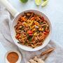 - Couper en petites lamelles la courgette, le poivron et les oignons nouveaux. Les faire revenir dans la poêle avec l’huile de colza et les pousses de haricots mungo.