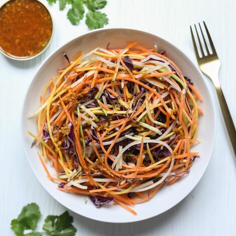 - Utilisez un couteau à découper en spirale ou un éplucheur pour transformer les courgettes, les carottes, le rutabaga, le radis et le chou en fines nouilles de légumes.