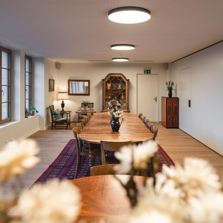Notre troisième salle, «la Bibliothèque», bénéficie pleinement de la lumière du jour grâce à sa baie vitrée orientée direction lac. Son aménagement et sa décoration contemporaine sont une invitation à la convivialité et à la créativité.